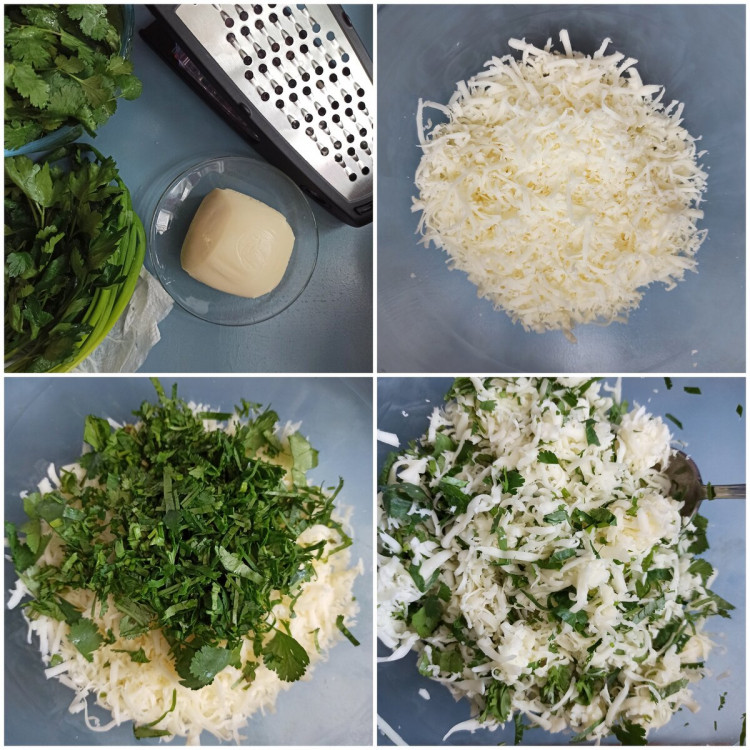 - Сир натерти на великій тертці. Зелень помити і дрібно нарізати, змішати з сиром.