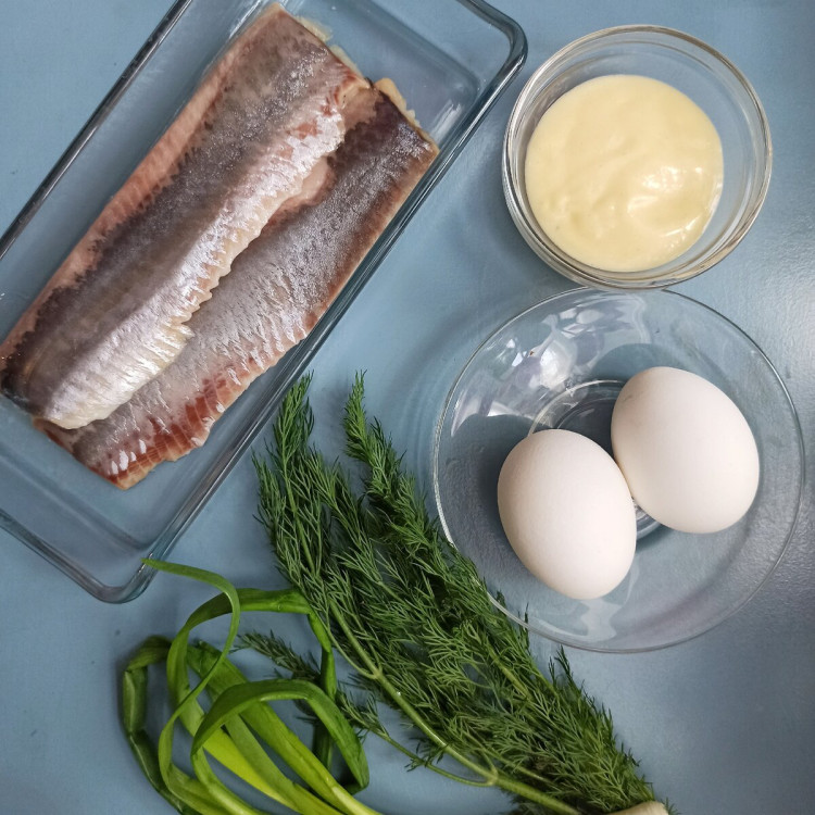 - Перемішати оселедець, з яйцями, зеленню і майонезом.