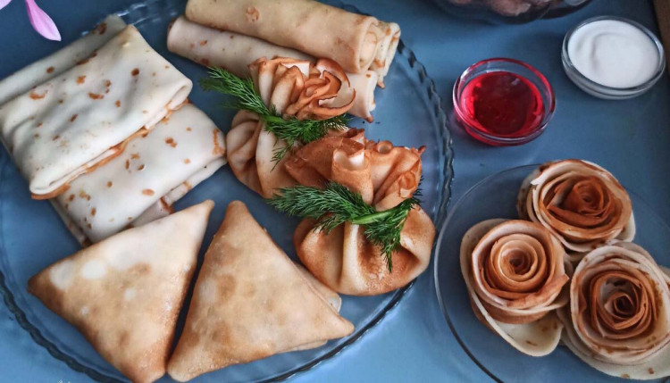 Млинці мене завжди виручають, коли потрібно швидко, смачно і недорого нагодувати сім’ю. А якщо ще красиво подати млинці, то стіл виходить дуже ошатний! Щоб загортати начинку в млинці, потрібно щоб їхні краї стали м’якими, для цього тарілку з млинцями накрити плівкою на 20 хвилин.