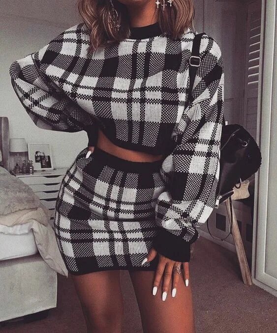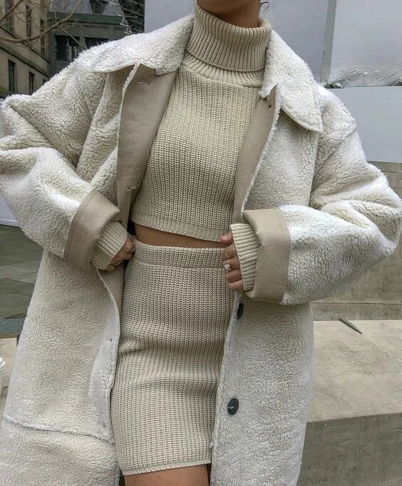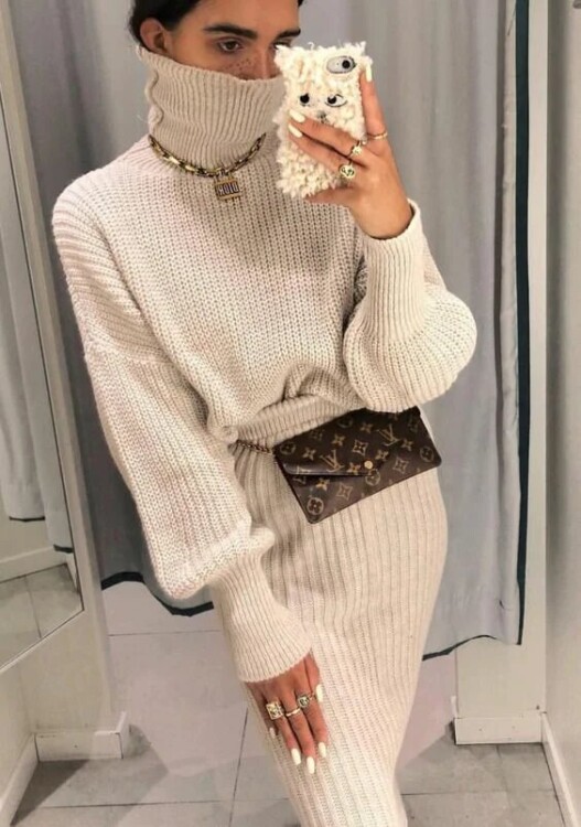 Перший комплект, який підкорить ваше серце цієї зими – це трикотажний костюм, що включає в себе міні спідницю і светр. Даний наряд підкреслить всі достоїнства вашої фігури, при цьому ви будете відчувати себе комфортно і стильно.