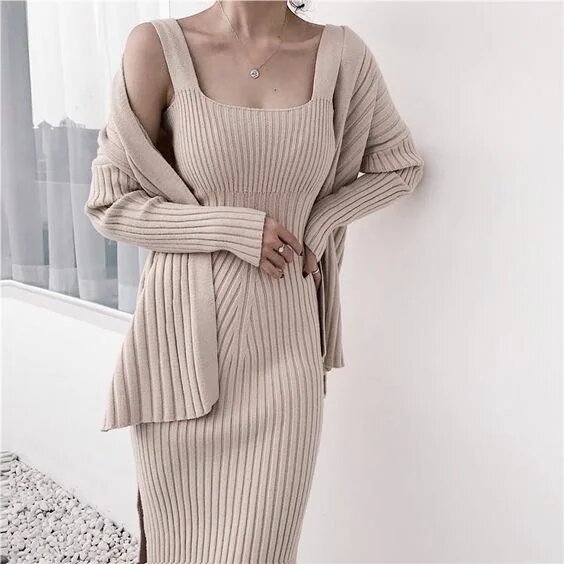 Трикотажний сарафан міді довжини прямого силуету + в’язаний кардиган – тандем, який ідеально впишеться в базовий гардероб модниці будь-якого віку.