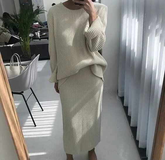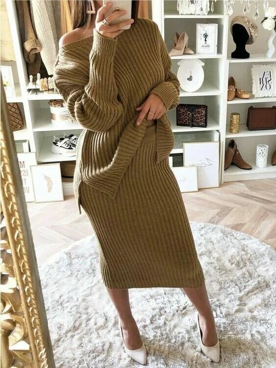 Максі Силуетна спідниця + оверсайз светр – ще один вдалий варіант наряду, який підійде для будь-якого заходу. Даний комплект одягу можна носити, як з заправленим светром, так і поверх, в першому випадку ваша талія буде виглядати тонкою і тендітною. Стилісти радять носити трикотажні костюми з громіздкими черевиками або гостроносими високими чобітьми.