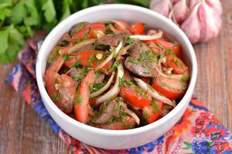 Готовий салат одразу подаємо на стіл. Ніжна печінка, соковиті помідори, хрустка цибуля, зелень і часник – це дуже смачно.