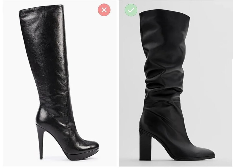 Чоботи, які обтягують ногу по всій гомілці, на сьогодні не найактуальніше рішення в плані взуття. Ситуацію зліва посилює ще і “грайливо” кирпатий круглий носок, а також підносочна платформа і каблук-шпилька. Все ж ми рухаємося до того, щоб оточити себе зручними речами, тому вибираємо широкий стійкий каблук. Актуальні чоботи мають широку халяву.