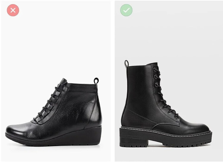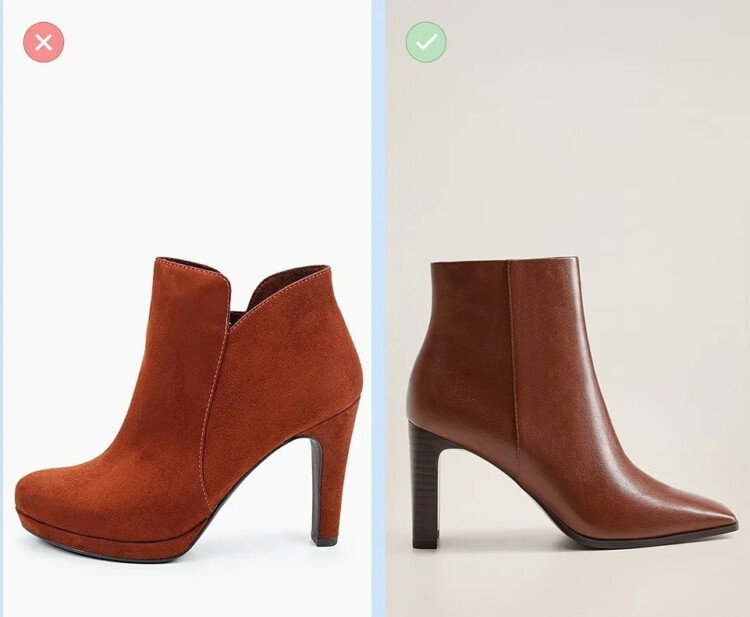 Для багатьох оптимальний варіант взуття на міжсезоння – це ботильйони висотою до щиколотки. Дійсно, вони прекрасно поєднуються і з брюками, і зі спідницями, і при цьому захищають від сльоти і негоди. Але тут теж важлива форма: на фото зліва хороший хіба що колір і матеріал, а от решта застаріло. Круглий мис, знову тонкий звужений каблук. Придивіться до більш сучасних моделей: у них може бути звужений гострий або квадратний мис, прямий стійких каблучок, виглядає це актуальніше і набагато делікатніше.