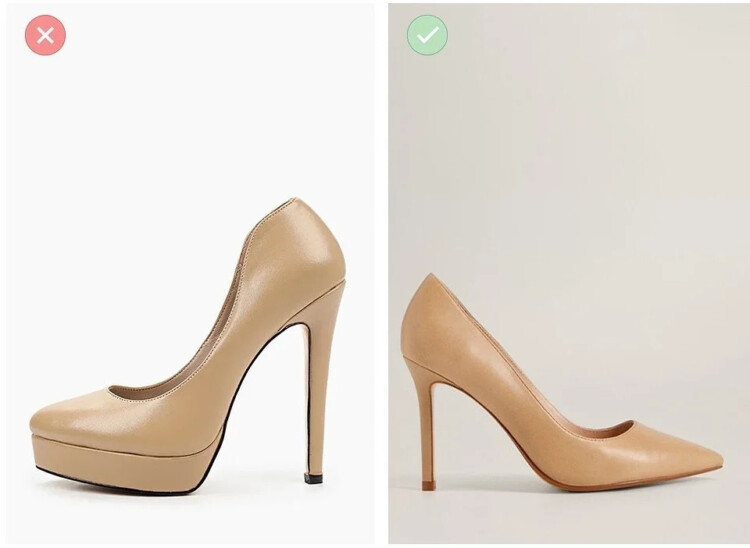 Туфлі-човники в бежевому кольорі – це мастхев для всіх любительок жіночних і елегантних образів, в яких не обійтися без підборів. Модель на фото зліва краще обходити стороною: занадто високий каблук, круглий носок і велика підносочна платформа роблять їх старомодними і навіть трохи вульгарними. Справа ж – оптимальна модель “на століття”, такі човники (без платформи, з гострим носком) не виходять з моди.