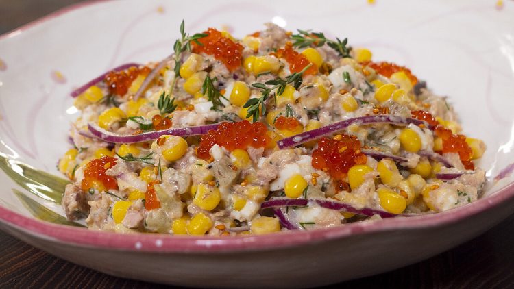 Тонкими півкільцями ріжемо цибулю, очищаємо від шкірки малосольні огірочки і нарізаємо їх дрібними кубиками. Дрібно нарізаємо кріп. З’єднуємо в мисці кукурудзу, тунець, нарізані огірочки, цибулю та кріп. Виделкою розминаємо варені яйця і також додаємо їх у миску. У салат відправляємо дрібно нарізаний зубчик часнику, збризкуємо лимонним соком, заправляємо все майонезом. На смак додаємо сіль, перець і все ретельно перемішуємо. Салат викладаємо на гарну тарілку, прикрашаємо червоною ікрою, гілочками кропу та посипаємо смаженим кунжутом.