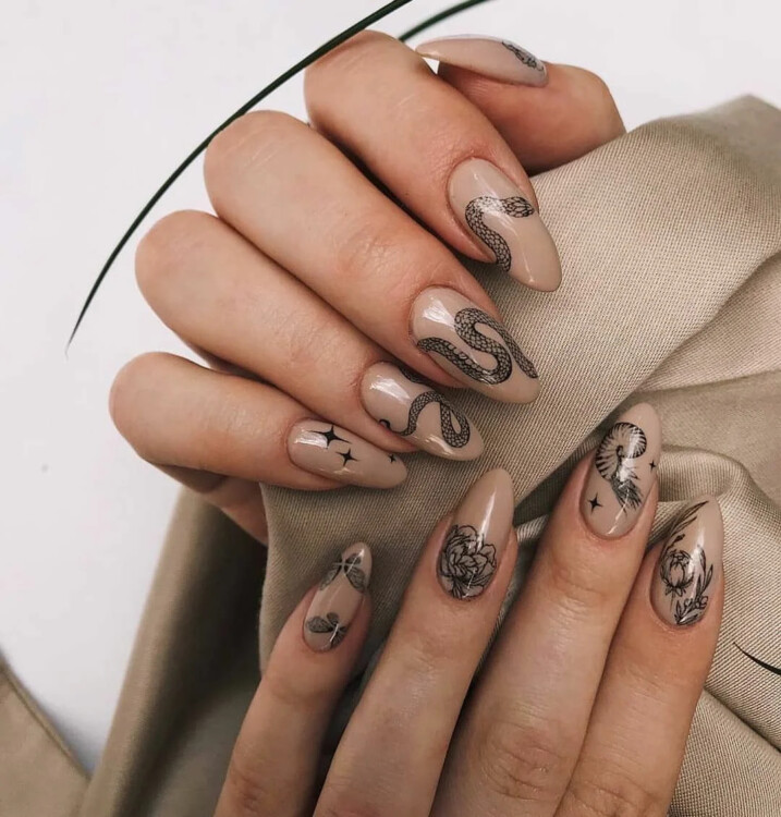 Нюдовий колір прекрасно гармонує з білим кольором. Манікюр виходить самодостатнім і повітряним. На нюдовому відтінку можна зобразити малюнок або виконати стемпінг. Жіночно виглядають вензелі і візерунки. Подивіться добірку, обов’язково знайдеться привабливий для вас варіант.