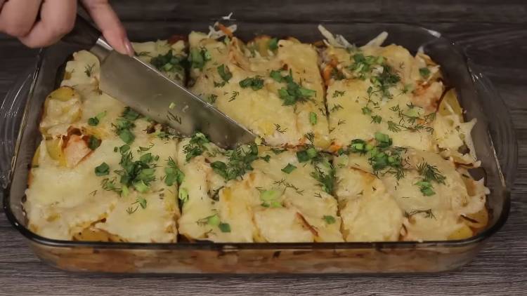 Збираємо нашу страву. Жароміцну форму змащуємо олією. Першим шаром викладаємо половину м’яса із цибулею. Зверху кладемо половину тертої моркви. Далі йде половина картоплі. Знову кладемо м’ясо, моркву та картопля. Ставимо форму в розігріту до 180 ° С духовку на 45 хвилин. Після цього посипаємо верх страви тертим сиром і знову поміщаємо в духовку (буде достатньо 15 хвилин).