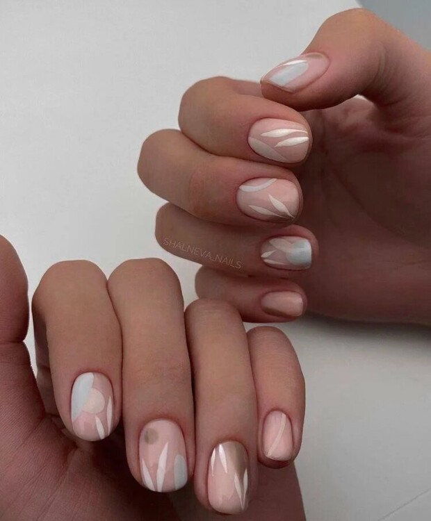 Нюдові і кремові відтінки завжди залишаються в тренді, тому що виглядають дуже акуратно і підійдуть під будь-який образ. Але в цьому році створюють незвичайні, повітряні дизайни навіть на однотонному, світлому покритті. Використовуйте абстракцію: тонкі лінії, плями різної форми і кольору, слайдери з малюнками, і ваш манікюр буде ніжним і яскравим одночасно.