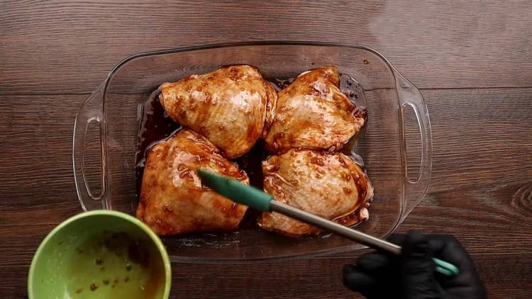 Перемішуємо нашу суміш. Готовий маринад розподіляємо поверх курячих стегон, а його залишки виливаємо у форму з куркою.