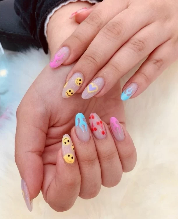 “Смішний” манікюр зі смайликами і навмисне дитячими малюнками чудово виглядає саме навесні, коли сама природа і обстановка наполегливо рекомендують щось веселе.