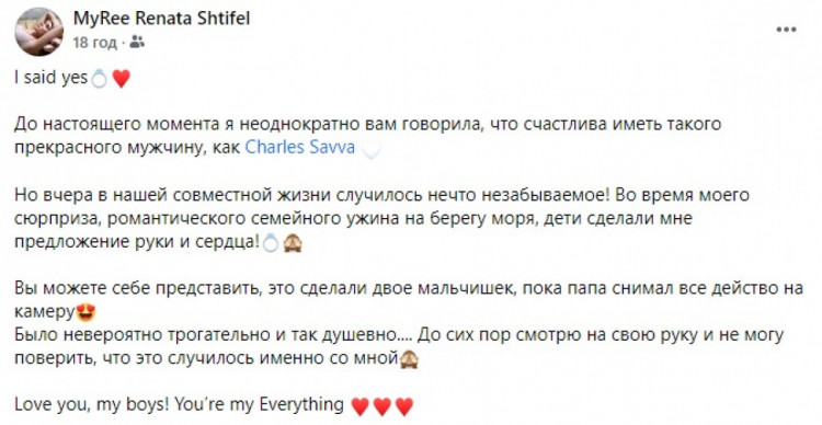 Про зміни в особистому житті Рената повідомила за допомогою соцмережі. Співачка оприлюднила романтичні фото, похизувалася обручкою з чималим камінцем та показала свого обранця.