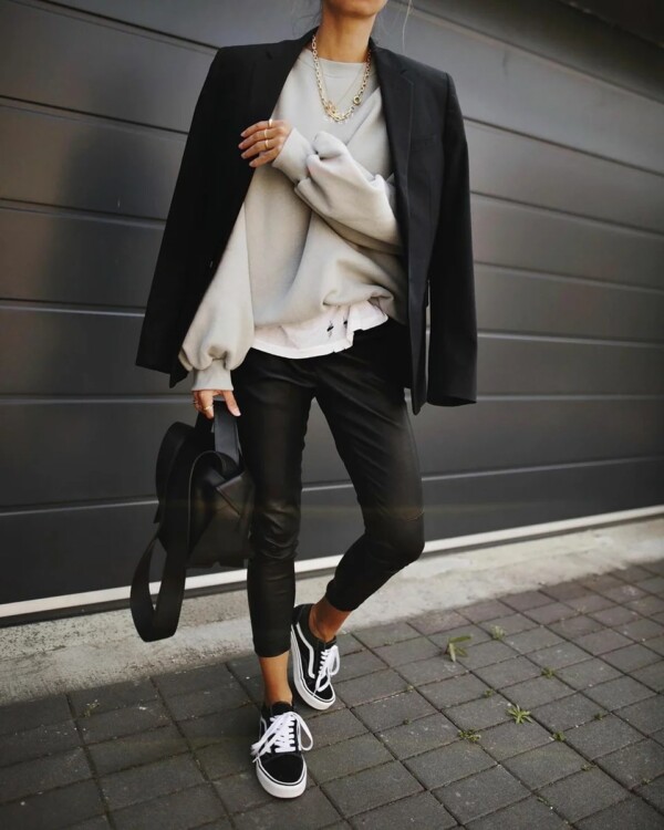 Такі штани складають основу строгого офісного стилю. Прямі завужені моделі з наведеними стрілками темних тонів відмінно поєднуються з білими сорочками, блузками, светрами і водолазками. У холодну пору року доповнюють наряд жакетами, куртками, піджаками. Човники на високій шпильці завершують образ ділової жінки.