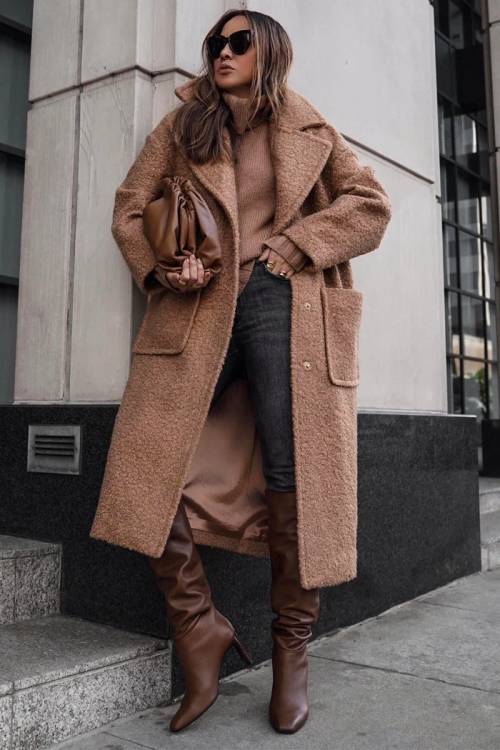 Якщо ваш вибір упав на комбі пальто та високі чоботи, простежте, щоб взуття заходило під поділ пальта. Тільки так ваші ніжки будуть надійно захищені від морозу та пронизливого вітру.