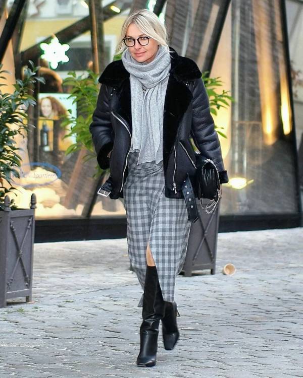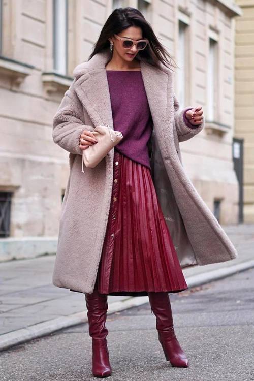 Жінки 40+ не цураються шкіряних речей. Джемпер, плісирована спідниця зі шкіри, високі чоботи та шубка “чебурашка” ідеально виглядають в одному образі.