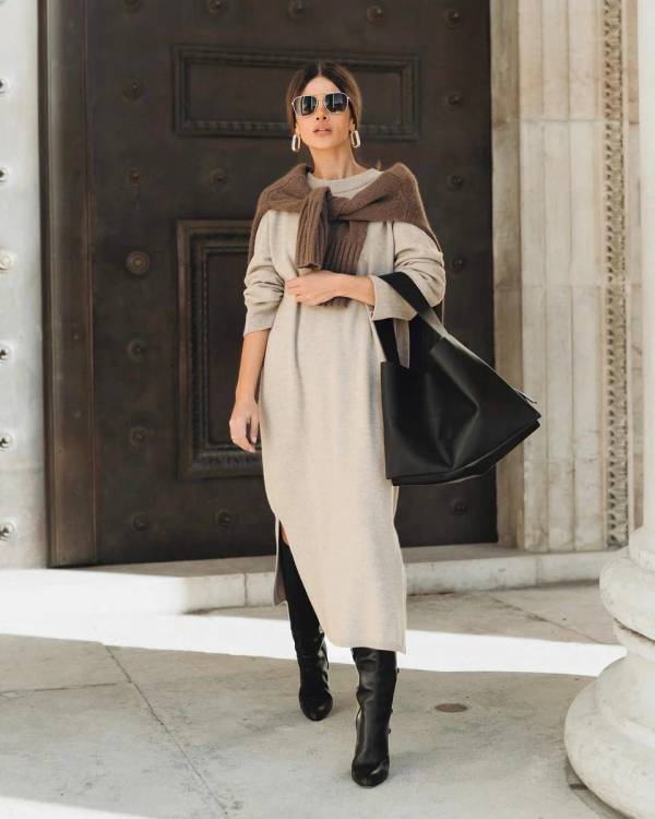Трикотажне плаття міді + високі чоботи – класичний дует на зиму. Верхній одяг підбирається залежно від погодних умов та ситуації. Найкраще підійде елегантне пальто або пуховик подовженого крою.