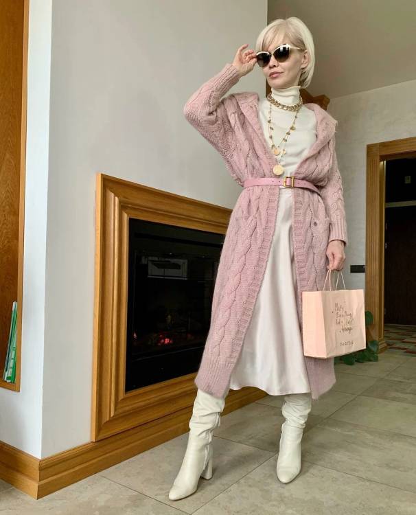 Кардиган – один із найзатишніших предметів жіночого гардеробу, він добре вписується в багатошарові образи. Дует пудрового і кремового відтінку вигідно освіжає образ, пояс дозволяє візуально позначити талію.