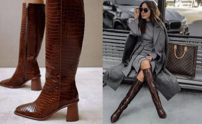 Чоботи з текстурованої шкіри рептилії – також є беззаперечним трендом сезону осінь 2020. Стилісти пропонують купувати чоботи благородних базових відтінків, їх легко “подружити” з різними стилістичними осінніми луками.