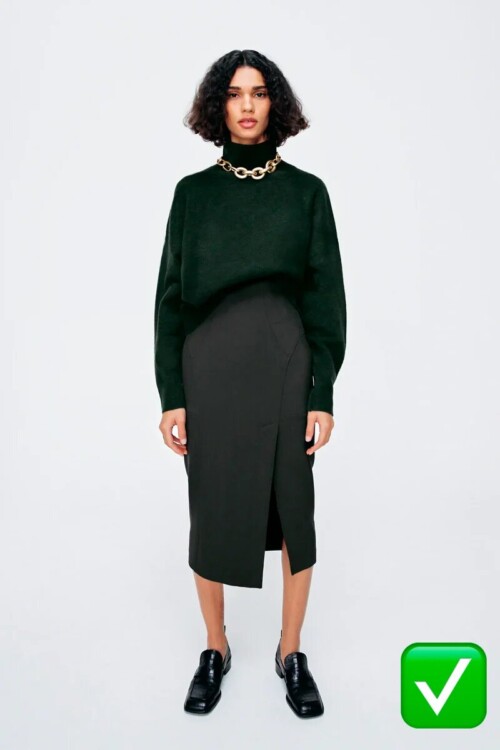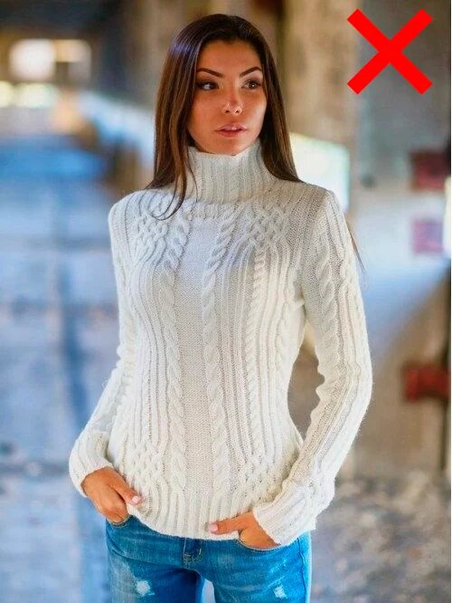 Комір у светра не повинен виглядати як безформний хомут. Зараз такі моделі не актуальні, вони ускладнюють образ і не завжди в кращу сторону.