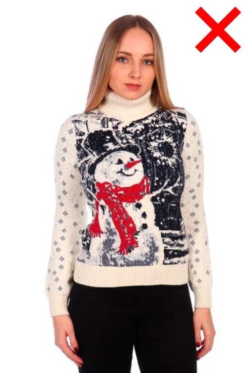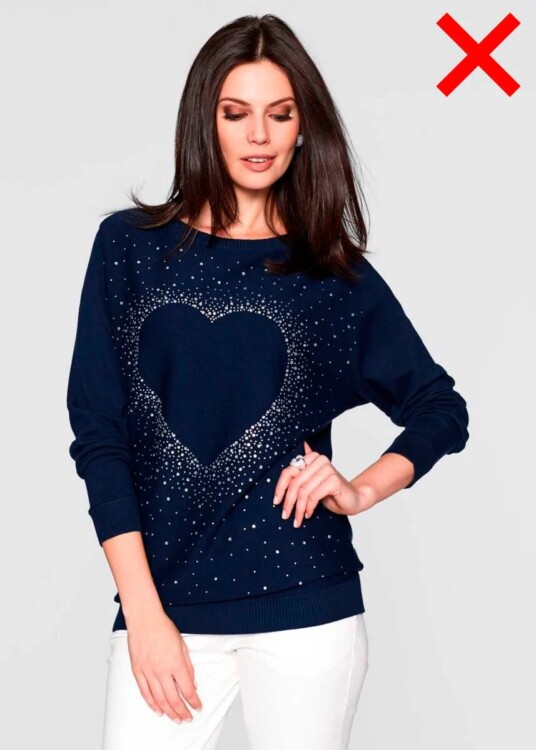 Модель светра, яка виглядає дивно і незрозуміло. Вона зовсім не прикрашає образ, а навпаки додає вам кілька років і виглядає дешево.
