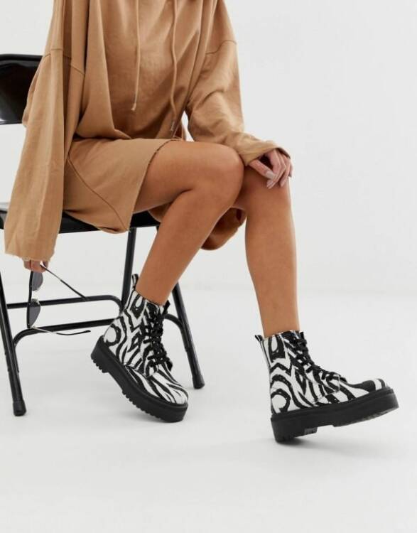 Стильні масивні черевики на шнурівці в цьому сезоні стилісти “прикрасили” звіриним візерунком – в результаті вийшло повсякденне і яскраве взуття для весняних образів.