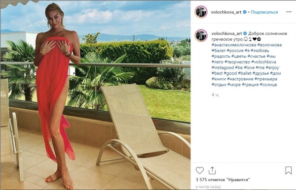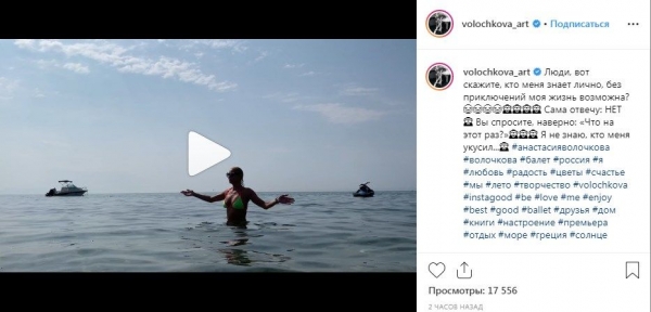 «Добре сонячне грецьке ранок», – підписала відвертий знімок балерина. Крім цього, Волочкова опублікувала відео, показавши, як вона плескає в теплій морській води. В описі ролика Анастасія розказала, що з нею в черговий раз сталося НП на відпочинку. Як розказала балерина її щось скуштувала. «Люди, від скажіть, хто мене знає особисто, без пригод моє життя можлива? Сама відповім: НІ. Ви запитаєте, співуче: «Що на цей раз?» Я не знаю, хто мене вкусив», – написала Волочкова. Нагадаємо, раніше знаменитість розбурхала мережу новим відео, поплававши в басейні, при цьому у всій красі продемонструвала свої пишні груди у відвертому купальнику. Так, на відео Настя плаває в басейні, п’є є шампанське і говорити своїм передплатникам, що «відпочине за всіх».