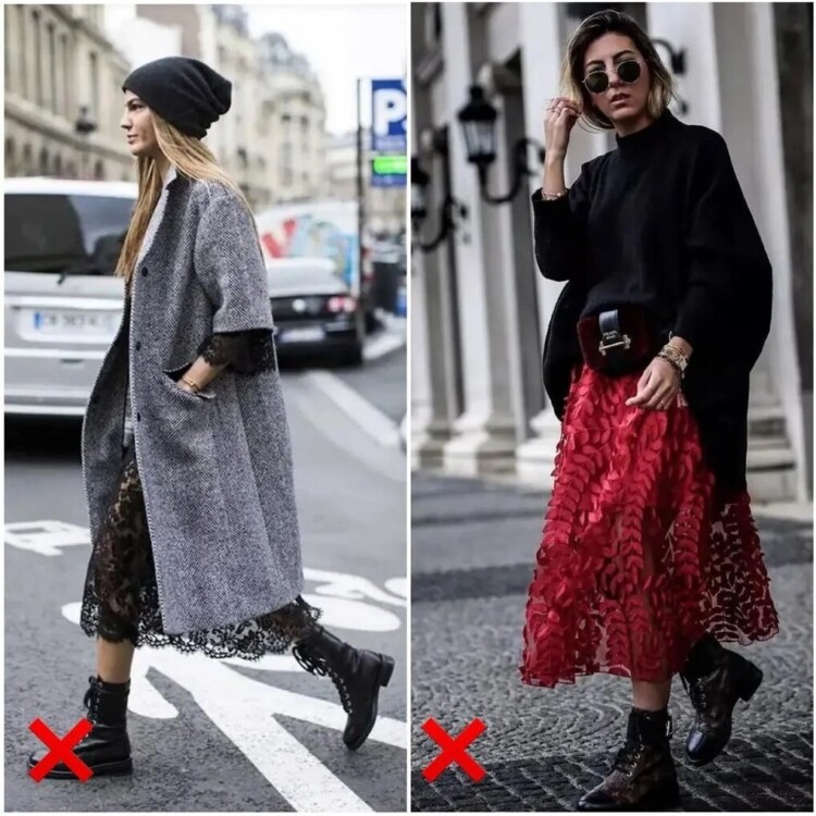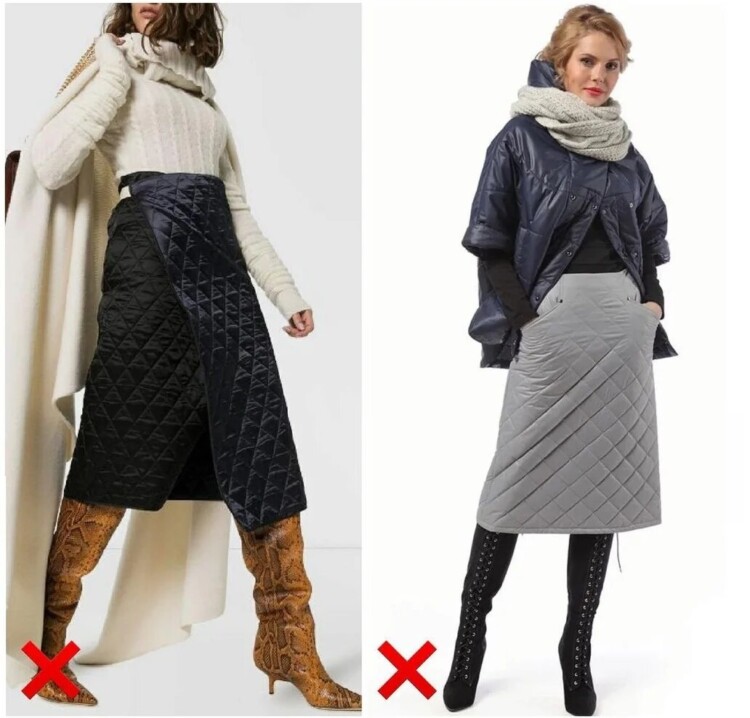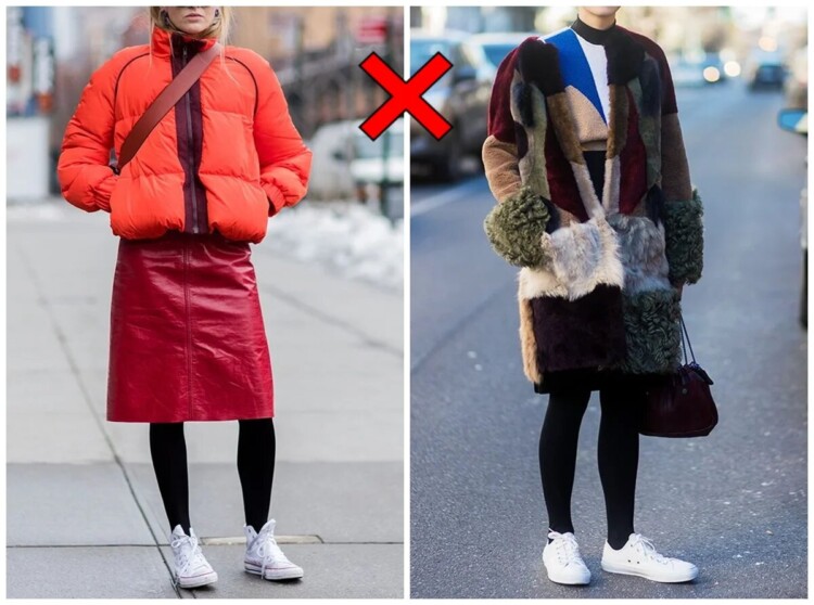 Будьте обережні з колірними контрастами в нижній частині образу. Коли у вас контрастна спідниця / колготки / взуття, є ризик отримати неприємну візуальну ілюзію – ноги здаватимуться коротшими, а вся фігура в цілому – приземлено. Біле взуття цілком може бути в зимовому гардеробі, але поєднувати з одягом його потрібно грамотно, якщо ви не хочете спотворити силует.