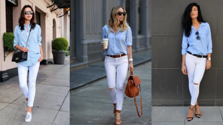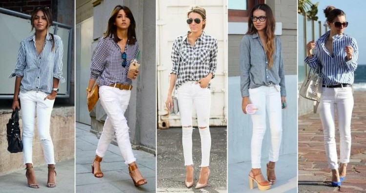 Для любителів вільного, більш недбалого стилю до білих штанів пропоную надіти просту повсякденну сорочку! У дуеті з білими джинсами вони створять ідеальний образ для літньої прогулянки і навіть побачення. Будь-яка жінка буде добре виглядати в білих джинсах, на високих підборах і в сорочці. У цьому сезоні зверніть увагу на сорочки в клітину або з смужками.