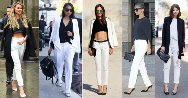 З яким взуттям носити білі брюки? Вони універсальні як і джинси, тому поєднуються практично з будь-яким взуттям. Носіть їх з балетками, кросівками, човниками, босоніжками на підборах, мулами.