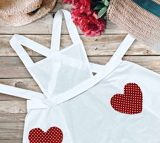 На цьому кроці додамо до нашого фартуха з нагрудником родзинку — декоративні кишені у формі серця. Для кожної кишені ми маємо по дві деталі, вже вирізані з тканини. Візьміть пару таких заготовок, потім складіть їх лицьовими сторонами разом і скріпіть шпильками. Далі, використовуючи швейну машинку, виконайте рядок по периметру серця, на відстані 6 мм (¼ дюйма) від краю. Залишіть незашитими близько 5 см збоку заготовки. Після цього зробіть надсічки на вигнутих частинах серця і виверніть його на лицьову сторону через залишений отвір. Повторіть ці дії для іншої пари деталей.