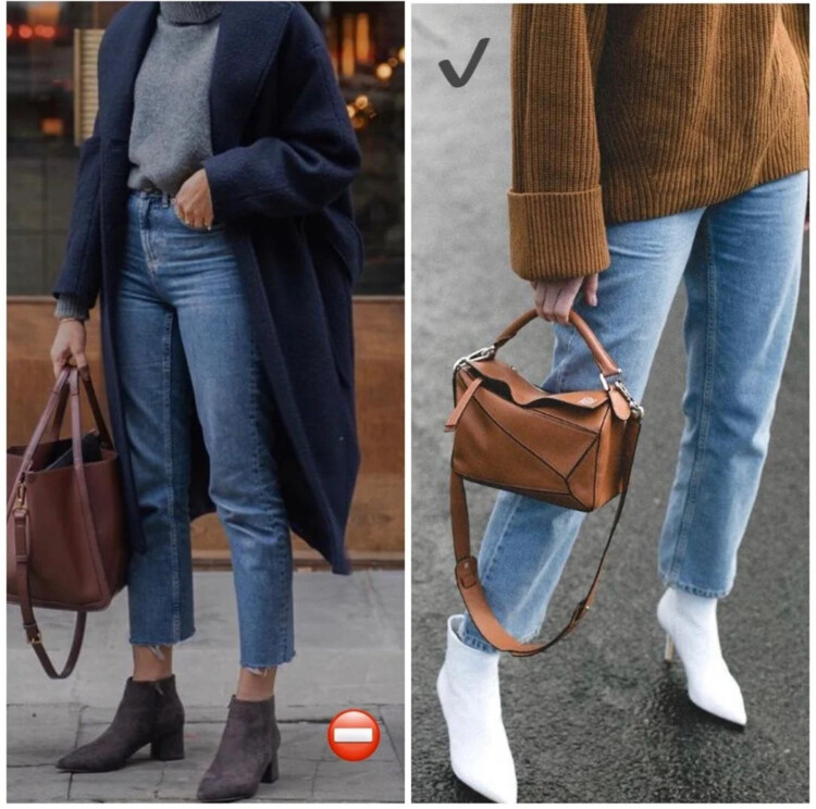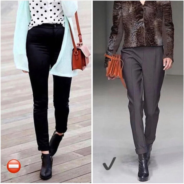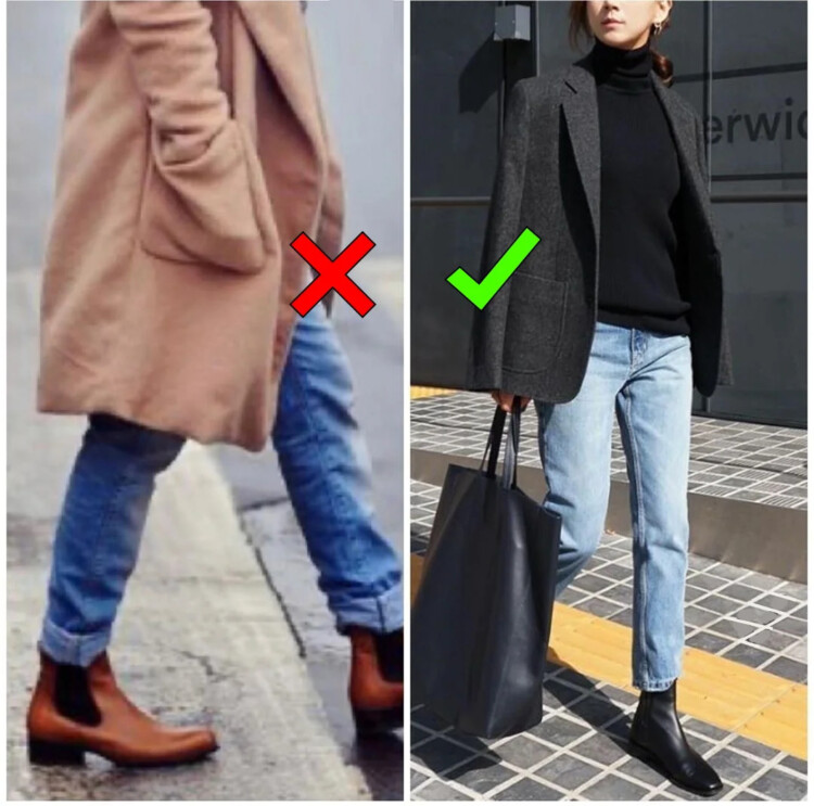 Часто неохайний ефект дають занадто товсті і широкі підкоміри на джинсах. Подивіться на фото зверху: зліва джинси явно довгуваті по зростанню, та ще й високі черевики челсі змусили жінку закатати джинси, через що вийде цей негарний підворот і складки по всій довжині штанин. Не бійтеся обрізати джинси під свій зріст: так зовнішній вигляд буде набагато більш охайним.