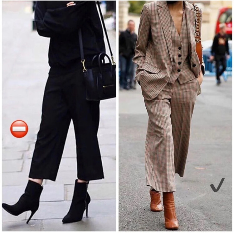 Просвіт голої ноги між ботильйонами і брюками – це погано не тільки тому, що ви так застудите собі щиколотки. Ще одна проблема – така комбінація створює контрастну лінію, яка візуально ріже вам зростання і вкорочує ноги. Так що якщо просвіт все ж з’явився, можна приховати його темними колготками.