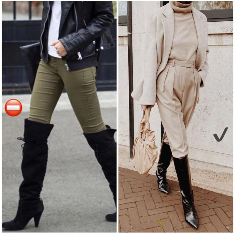 Ще в минулому сезоні до нас повернулася мода на штани, заправлені в чоботи. Однак вона сильно відрізняється від того, як ми носили це раніше. Подивіться на колаж і постарайтеся побачити цю різницю: фасони брюк і джинсів стали більш вільні, це вже не обтягуючі скінні. Чоботи теж перестали облягати ногу: тепер це взуття з широкою халявою, добре тримає форму.
