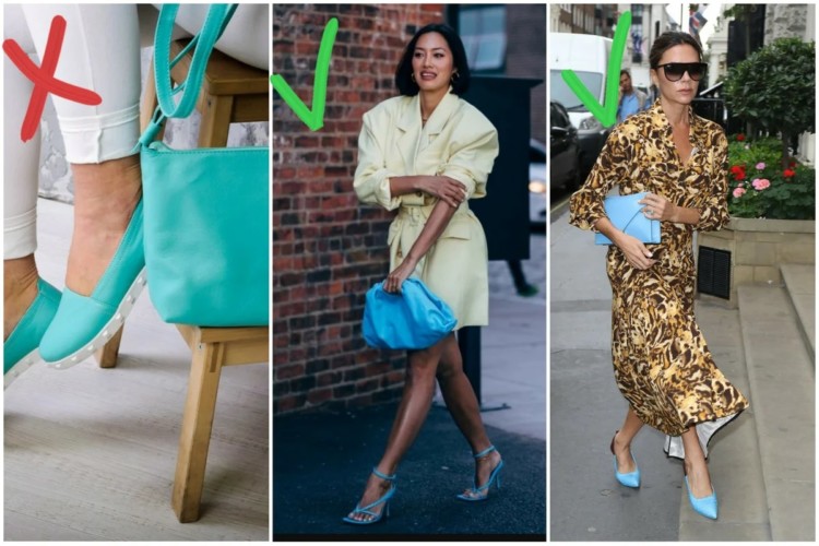 Хоча я вважаю, що це правило вже застаріло, і поєднувати сумку і взуття одного кольору в образі можна. Але тут ще важливу роль відіграє актуальність і сучасність як взуття, так і сумки. Ще близько двох років тому Вікторія Бекхем наплювала на це модне правило і відправилася на світський захід у ансамблі з синьою сумочкою і таких же туфель. А на тижні моди в Нью-Йорку ще минулої осені стрітстайлери показали класні образи з сумочками в тон взуття. І хто їм може сказати, що вони виглядали старомодно?
