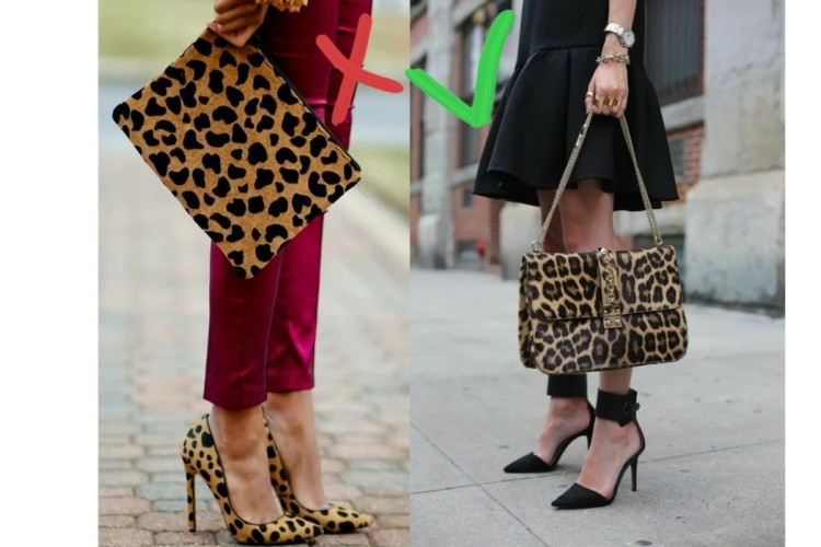 Будь ласка, не треба підбирати під леопардову сумочку леопардові туфлі. От не треба. Повірте. Це правило працює з усіма принтами, будь то зебра, пітон, горох, абстракція і так далі. Чомусь багато наших дівчат люблять такі поєднання і вважають, що неймовірно вдало комбінують леопарда з леопардом. А якщо вдасться ще й сережки такі ж знайти, так взагалі бомба! Ні.