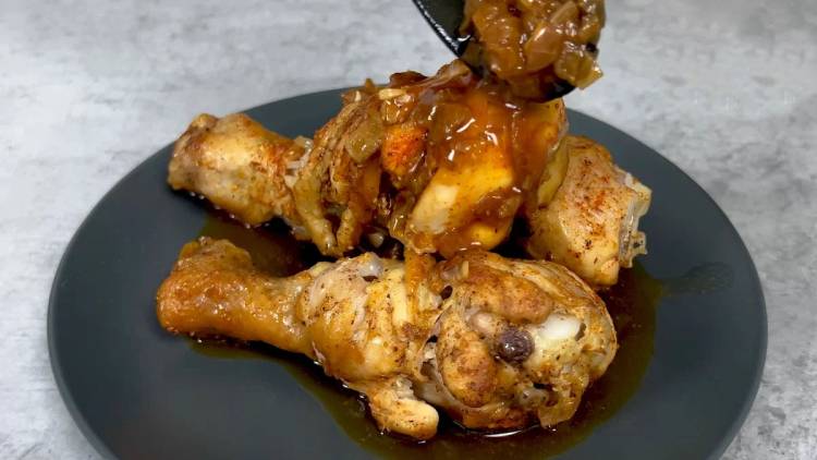 Зменшуємо вогонь, накриваємо кришкою і тушкуємо курку 30 хвилин. Під час готування кілька разів поливаємо курку маринадом.