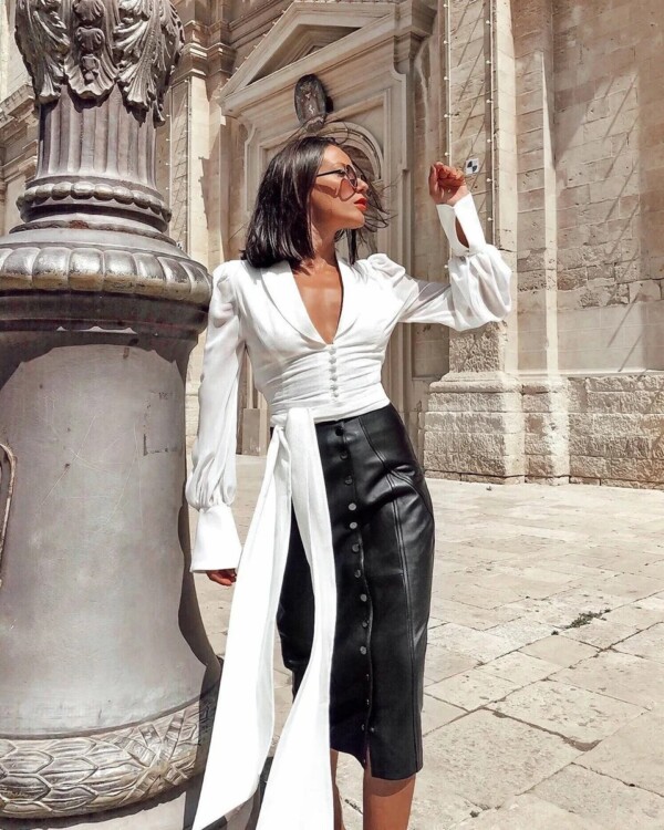 При виборі супер стильної спідниці-олівець зі шкіри необхідно підбирати більш лаконічний і простий верх. Підійде біла напівпрозора блузка, непомітна сорочка. Шкіряна спідниця-олівець виглядає на жінках шикарно, але варто розуміти, що влітку в ній буде трохи жарко.