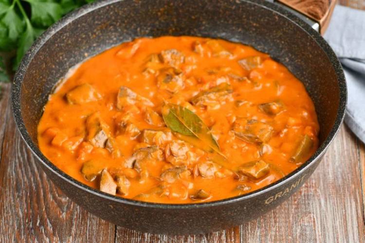 Соус стає густим та яскравим, печінка виходить ніжна. Страва дуже гарна і смачна.