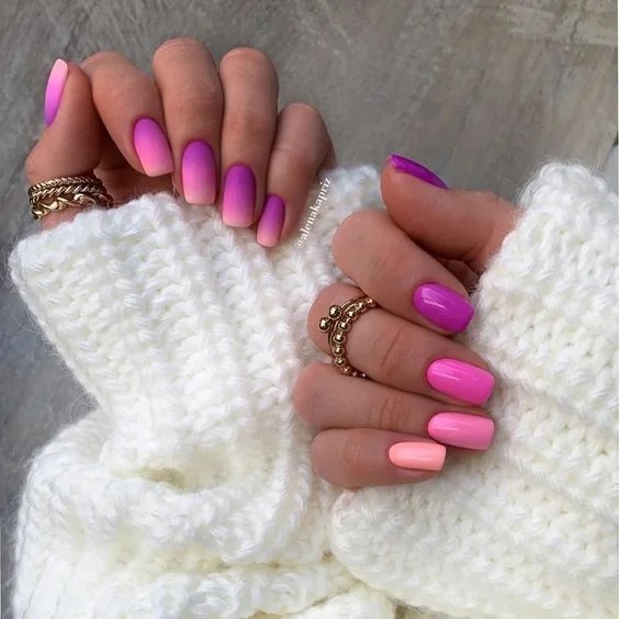 Градієнт на нігтях завжди виглядає дуже ефектно. Особливою популярністю зараз користується плавний перехід з нюдового відтінку в яскравий або навіть неоновий колір: