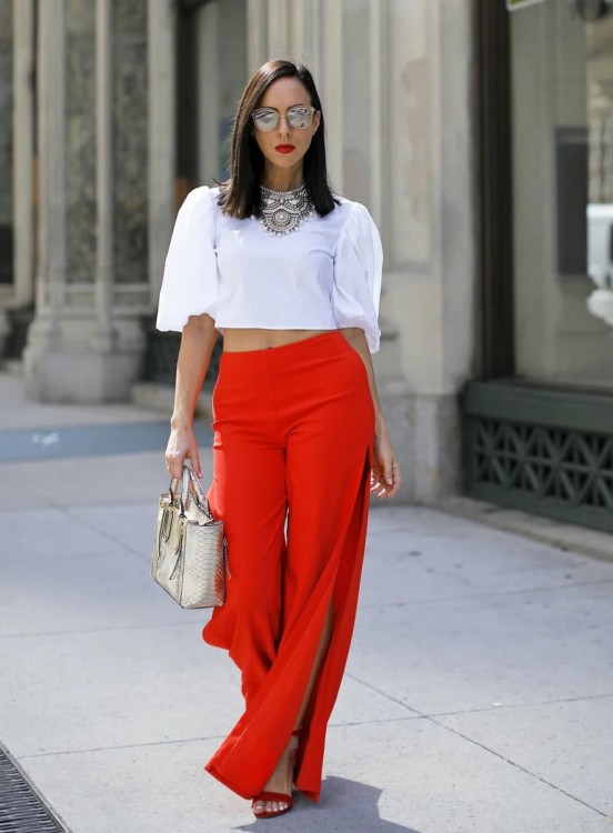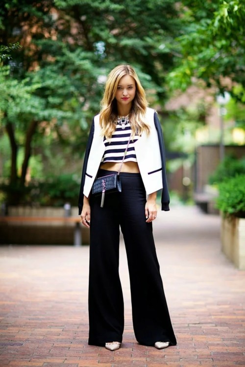 Більше того, не варто вибирати широкий верх, якщо звичайно не йдеться про невагому блузку з ідентичного палаццо матеріалу. Подібна комбінація також має право на існування.