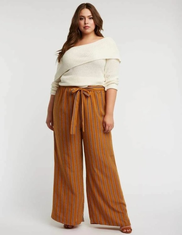 Дамам з пишними формами краще надягати штани з запахом. Також витягнути силует допоможуть однотонні варіанти спокійних кольорів, а висока посадка правильно розставить акценти і збалансує пропорції фігури.