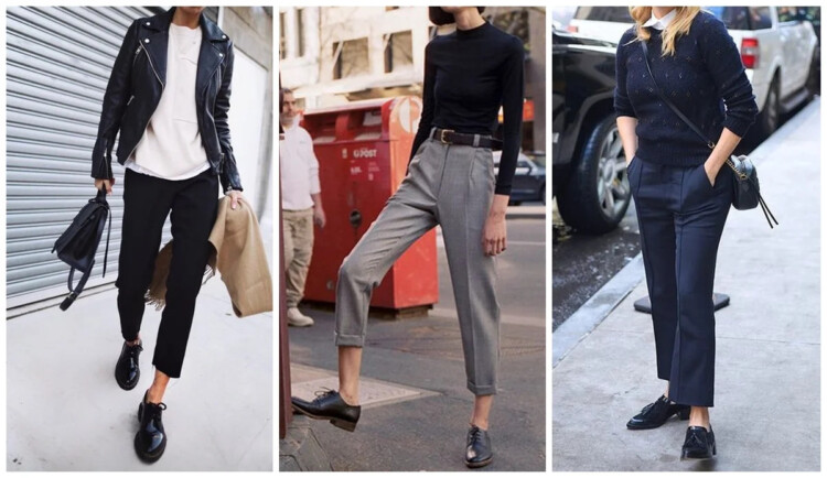 Класичні варіанти взуття на осінь – це черевики в чоловічому стилі, оксфорди, броги, дербі, лофери. Вони найкраще поєднуються саме з брюками, створюючи потрібний строгий настрій. Носимо їх з укороченими офісними брюками і звуженими джинсами. Добре підходять для офісного гардероба.