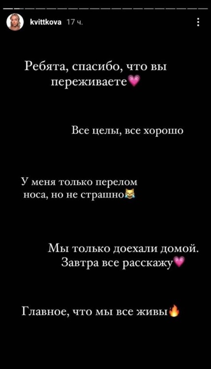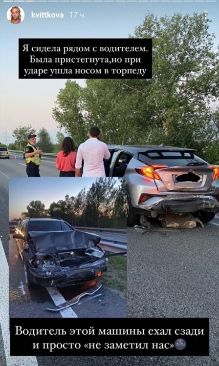 “Головне, що всі живі”, – зазначила Квіткова, підкресливши, що під час аварії дістала перелом носа.
