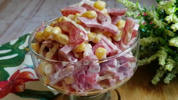 У чаші з’єднуємо цибулю, помідори, ковбасу. Додаємо консервовану кукурудзу, сметану, сіль та чорний перець за смаком. Сметану можна замінити майонезом. Добре перемішуємо продукти.