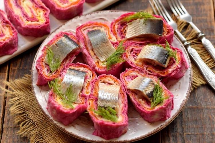 Салат подається на стіл у вигляді порціонної закуски. Всі інгредієнти подрібнюються на тертці, використовуються в якості начинки для тонкого лаваша. У підсумку виходить тришаровий рулет, який досить оригінально виглядає в розрізі. Перед подачею порційні шматочки доповнюються шматочками слабосоленого оселедця, що повністю віддає рулету оригінальний смак салату.