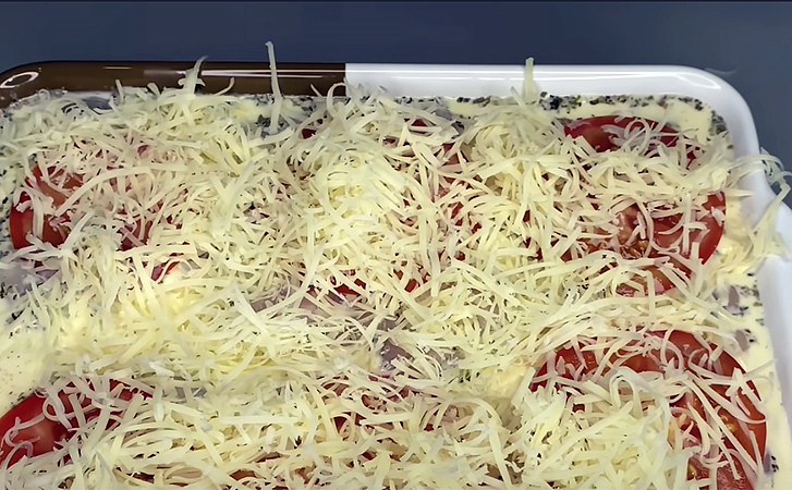 Зверху розкладаємо нарізані кружальцями помідори, їх в свою чергу посипаємо натертим на великій тертці сиром і ставимо в розігріту до 200 градусів духовку на 35 хвилин.