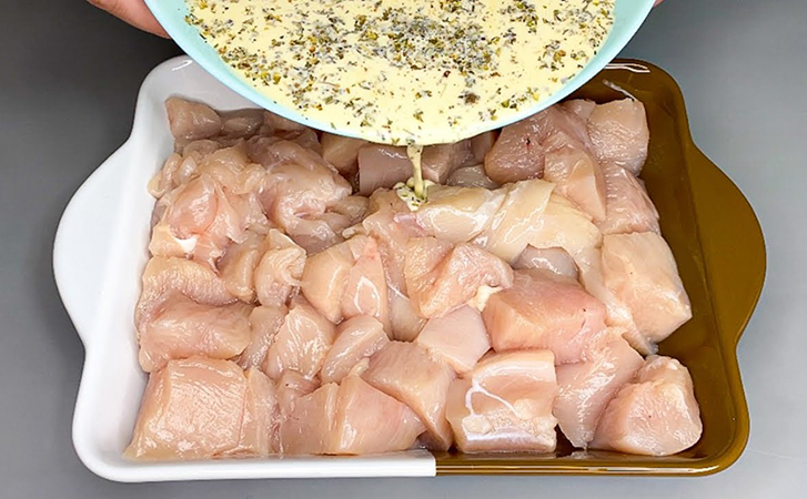 Куряче філе нарізаємо невеликими шматочками в глибоку ємність. В окремій мисці збиваємо вінчиком два яйця з вершками і приправами, потім соусом заливаємо курку.