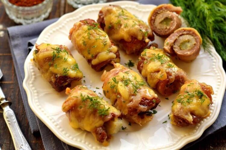 Якщо вам набридли звичні м’ясні котлети або відбивні, приготуйте смачні рулетики з м’яса з начинкою. Для цього відмінно підійде м’якуш свинини, вона нарізається на порційні шматки, які відбиваються, маринуються і скручуються в невеликі рулети. В якості начинки використовуємо мариновані огірочки. Запікаються рулетики під сирною скоринкою, виходять дуже ніжними і соковитими, має пікантний смак за рахунок маринованих огірків.