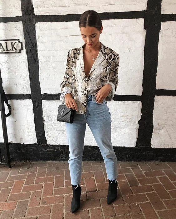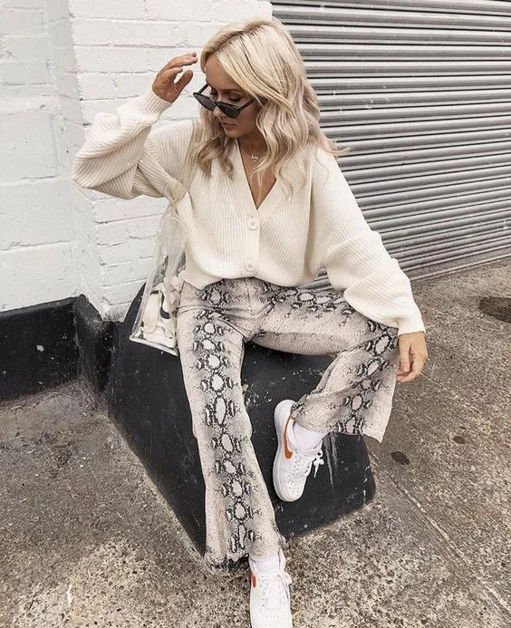 На черзі ще один анімалістичний тренд, а саме зміїний принт. Ця новинка стала актуальною нещодавно, але вже встигла завоювати серця багатьох модниць. Штани в хижий принт можна поєднувати з однотонними затишними кардиганами, а сорочку або блузку в зміїне забарвлення найкраще поєднувати з базовими джинсами з високою посадкою.
